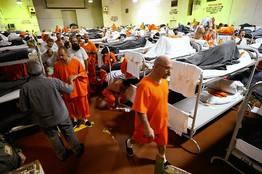 Getty Images: States spend $50 billion a year on corrections. Above, a gym housing inmates at a California prison.